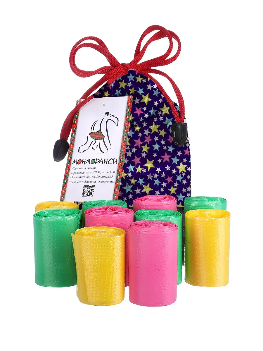 Наш продукт идеально подходит для всех видов и размеров собак - от маленьких пород до крупных. Они обеспечивают достаточно пространства для собачьих отходов и безупречную гигиену. В наборе из 10 разноцветных рулонов по 20 шт. в каждом. Изготовленные из плотного полиэтилена и упакованы во многоразовый цветной мешочек для хранения. Размер пакета 30х40 см.