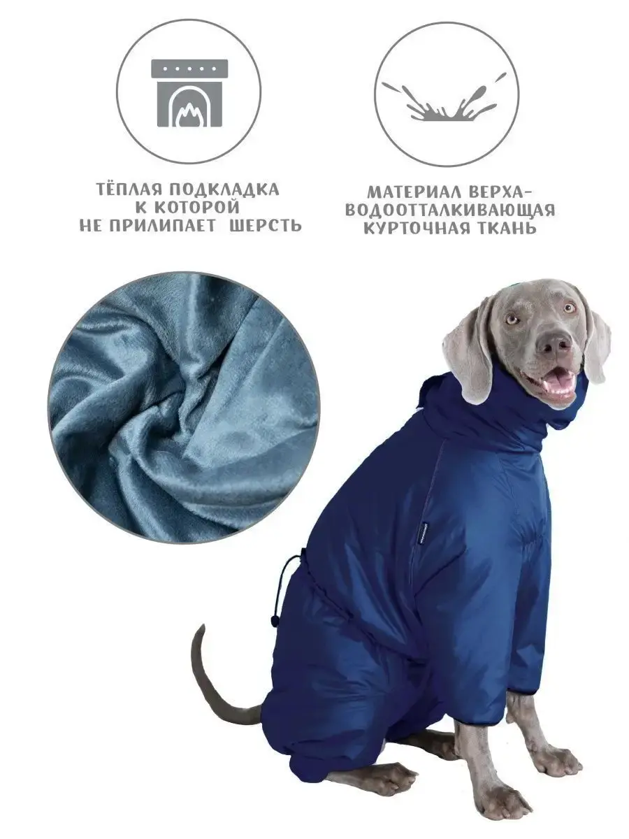 Комбинезон полностью закрывает живот собаки, ворот регулируется кулиской, фиксируется кнопкой, на спине надежная застежка-молния, на рукавах и штанах манжет с резинкой. На поясе регулируемая резинка-затяжка для идеальной посадки комбинезона именно под вашего питомца. Длинный ворот выполнен в виде снуда до ушей с отверстием для поводка с защитным клапаном, а горловина фиксируется кнопками. Светоотражающий кант. Петелька для удобства хранения. Для мальчика на животе предусмотрена специальная отстрочка.