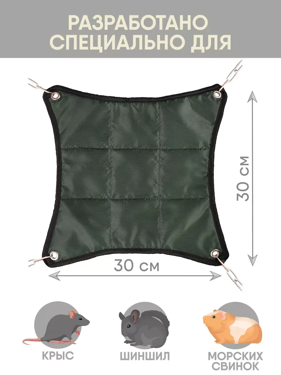 Домик для грызунов сделан в виде подвесной гамак для крыс, шиншилл, хорьков и других грызунов, размер 30*30см. Лежанка для крыс - мягкий и прочный гамак для грызунов с поверхностью из искусственного меха, вторая сторона из нейлона и искусственного меха. Гамак подвесной и крепится с помощью 4 прочных карабинов, подойдет для любых клеток, переносок. Подвесной гамак для грызунов прост в уходе, можно стирать при температуре 30 градусов. Отлично подходит для крыс, хорьков и шиншилл. Гнездышко для грызунов, хомяков,морской свинки, ежа, хорьков,в шиншилл.
