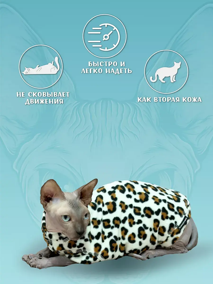 Флисовый жилет для кошек расцветки леопард разработан специально для породы сфинкс учитывая их строение тела. Жилет для кошки сшит с одним отверстием для лап, не вызовет дискомфорта при одевании, прогулки- в нем удобно бегать, ходить, одежды и идеально подойдет для приучения питомца к одежде. Свитер для кошек гипоаллергенный, теплый, уютный и комфортный .Одежда для сфинксов и котов защитит от холода, солнца и мелких механических травм. По низу изделия, на горловине и проймах предусмотрены эластичные резинки, чтобы любимец не мог сам вылезти из майки. Рекомендации по уходу за изделием: стирка при 30 градусов.