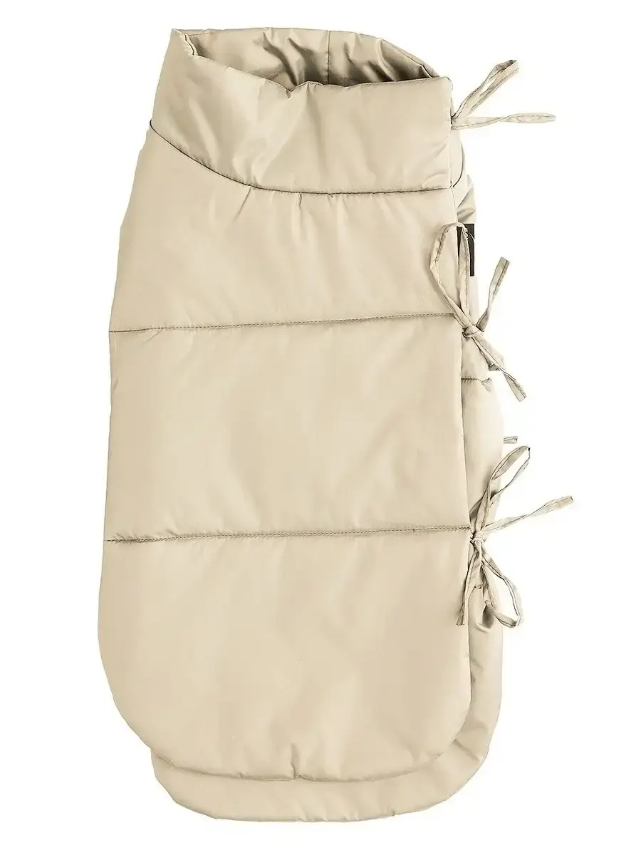 Жилет-одеяло для собаки функционален: снаружи ветрозащищенная, водоотталкивающая курточная ткань, внутри синтетический наполнитель- синтепон.